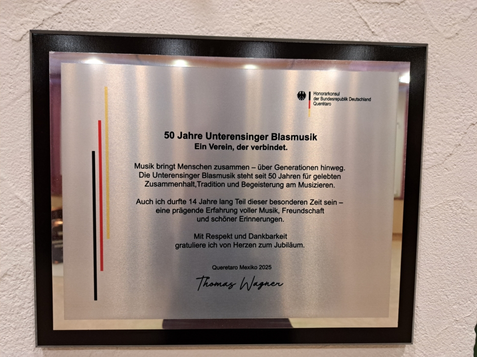 „50 Jahre Unterensinger Blasmusik. Ein Verein, der verbindet. Musik bringt Menschen zusammen – über Generationen hinweg. Die Unterensinger Blasmusik steht seit 50 Jahren für gelebten Zusammenhalt, Tradition und Begeisterung am Musizieren. Auch ich durfte 14 Jahre lang Teil dieser besonderen Zeit sein – eine prägende Erfahrung voller Musik, Freundschaft und schöner Erinnerungen. Mit Respekt und Dankbarkeit gratuliere ich von Herzen zum Jubiläum. Querétaro Mexiko 2025, Thomas Wagner. Honorarkonsul der Bundesrepublik Deutschland Querétaro.“