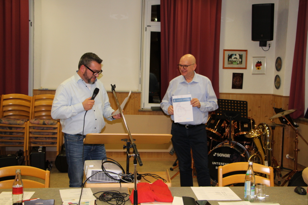 Herr Friz betonte, dass die Unterensinger Blasmusik in den letzten 40 Jahren viel Glück hatte, einen 1. Vorsitzenden zu haben, der das Amt mit viel Herzblut ausgeübt hat. Auch die Gemeinde Unterensingen profitierte hiervon. Einzigartig in Unterensingen sei, dass ein 1. Vorsitzender dieses Amt über 40 Jahre hinweg ausübt. Das Jubiläumsjahr 2025 des Vereins war für die Gemeinde ein Höhepunkt. Herr Bürgermeister Friz dankte Herrn Wagner für sein Engagement und dem gesamten Verein, dass die Unterensinger Blasmusik auch für die Gemeinde immer tätig ist und die Gemeinde bereichert. Klaus Wagner dankte Herrn Friz für die gute Unterstützung und Zusammenarbeit in den letzten 32 Jahren.